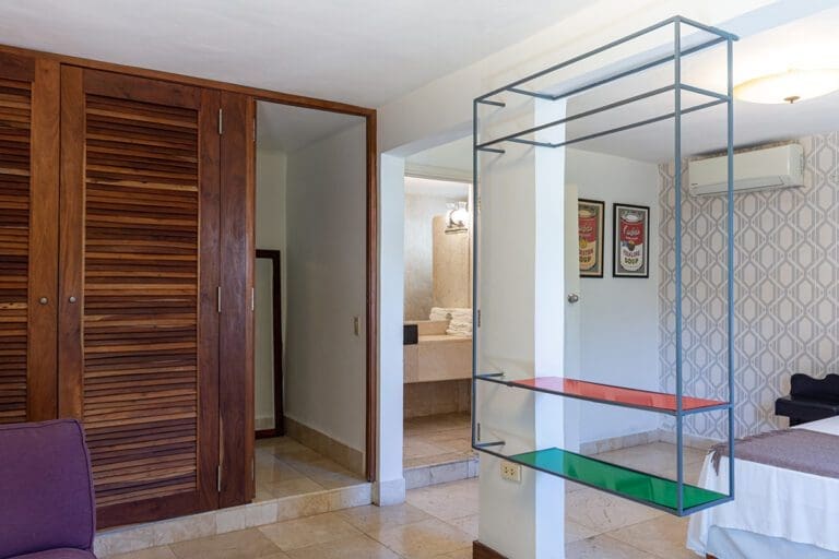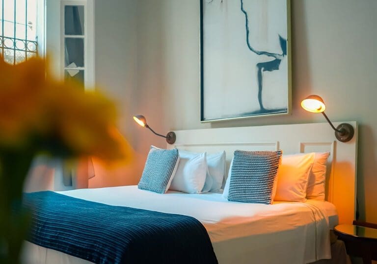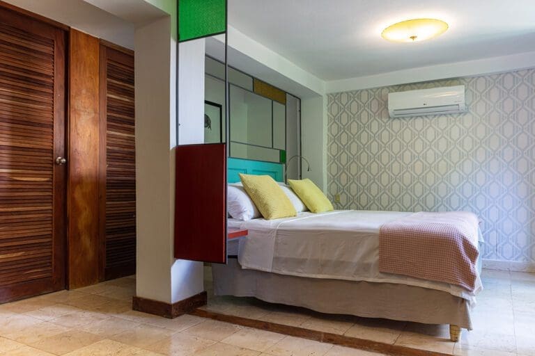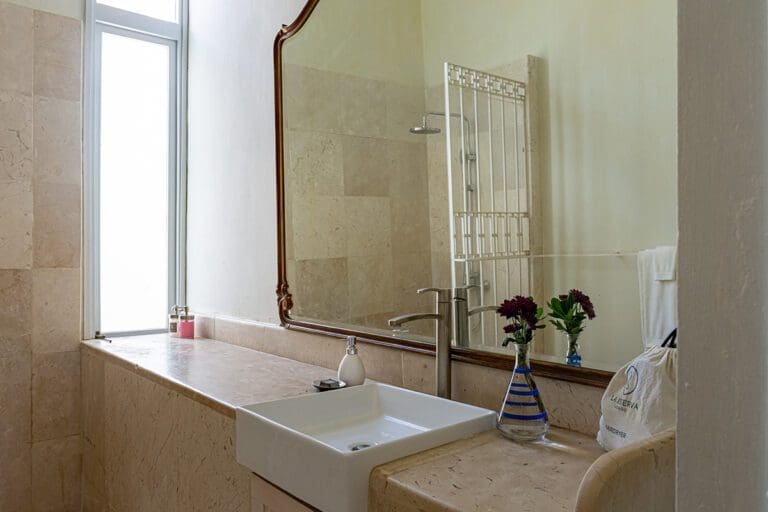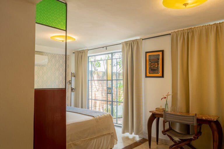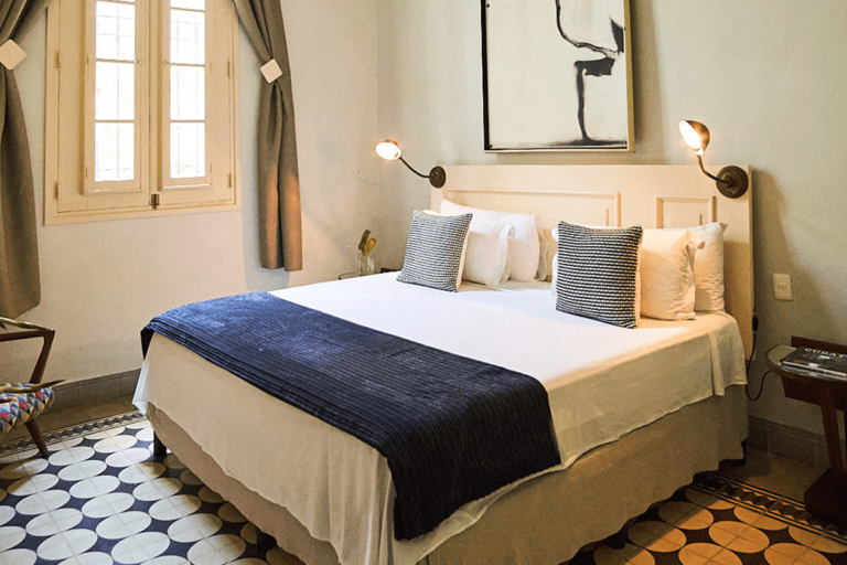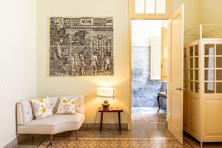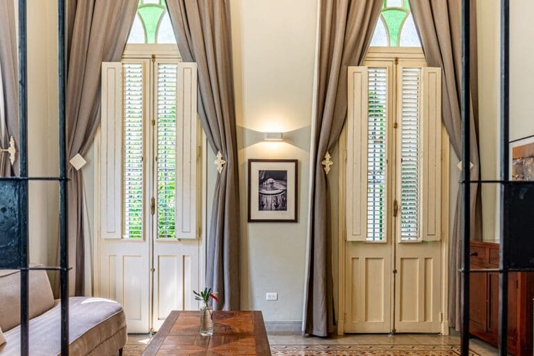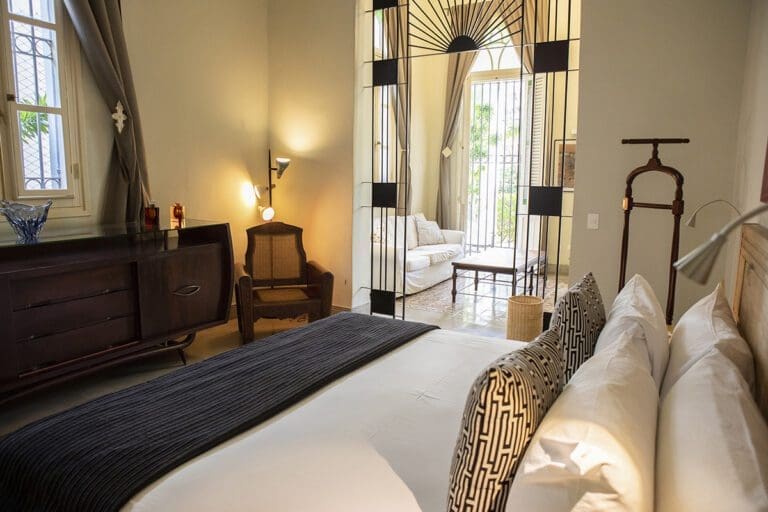 As you enter this room, you are greeted by a discreet play of light beams coming through the blinds and glass, precious woods, marble, a profusion of geometric and floral motifs, displaying a vibrant and captivating chromatic palette of colonial tiles. In this authentically cozy setting, the attention to detail of the hotel comfort will make your stay magical and renewing.