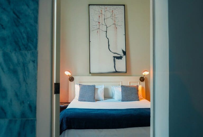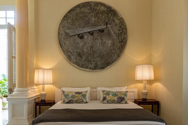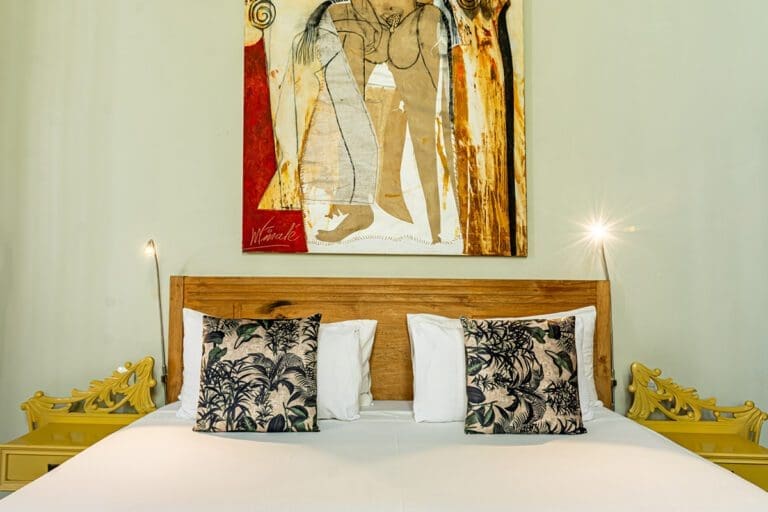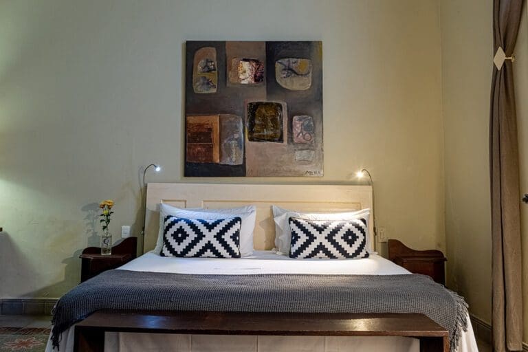 This room embodies comfort and understated elegance, featuring a soft color palette accented by darker tones for a touch of sophistication. At its center is a striking piece of modern art above the king-size bed, dressed in premium-quality linens. The contrast between the refined bedding and the traditional black-and-white mosaic flooring adds a unique blend of contemporary flair and local charm.