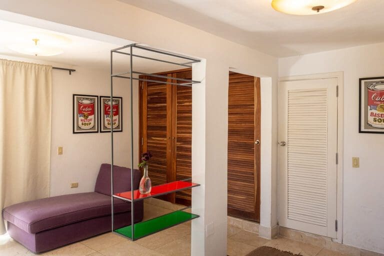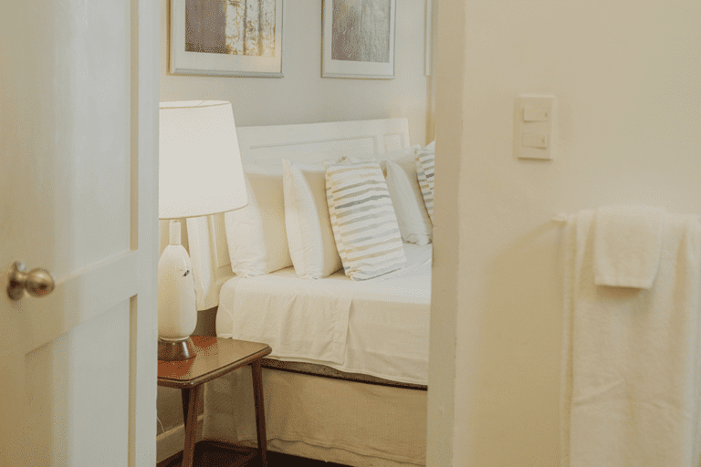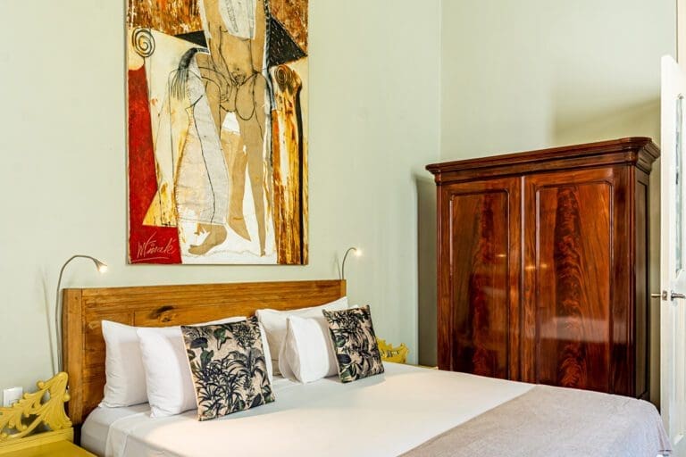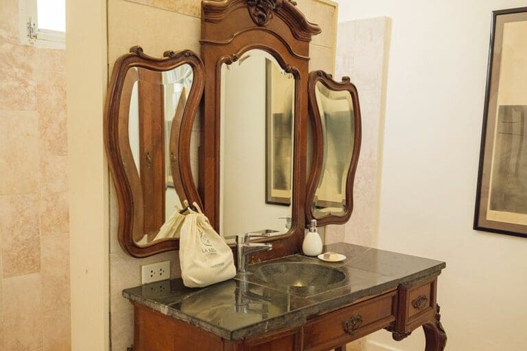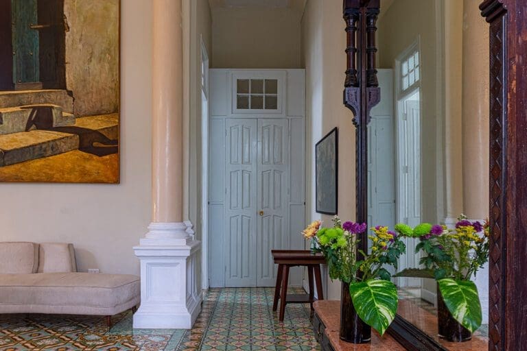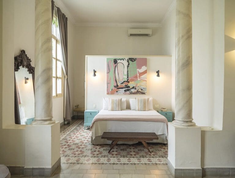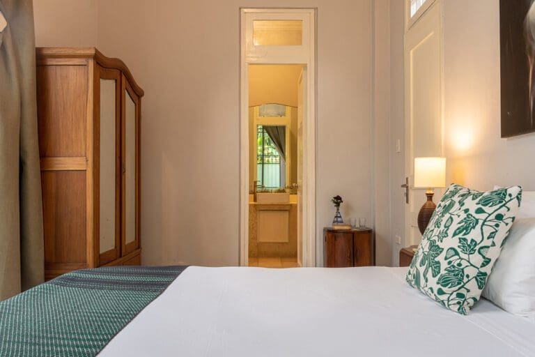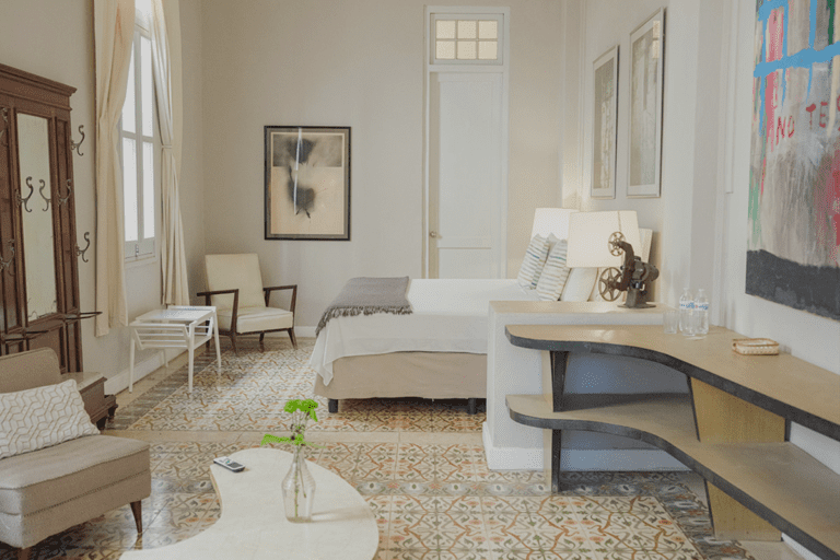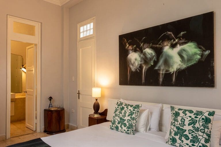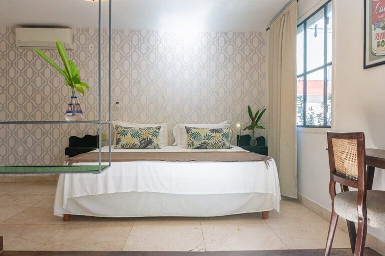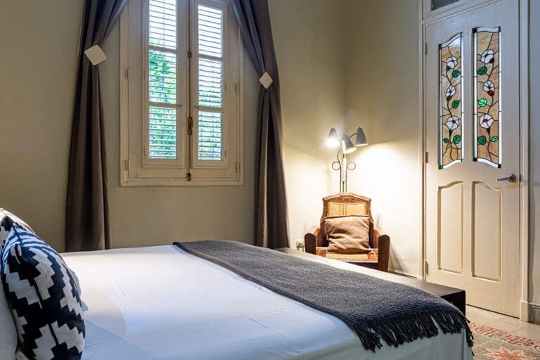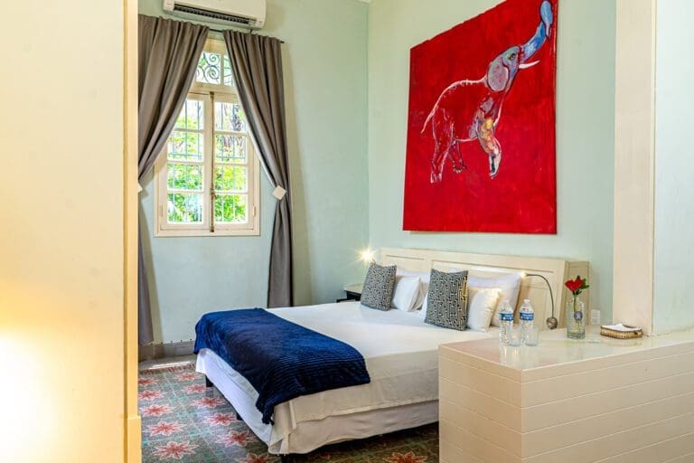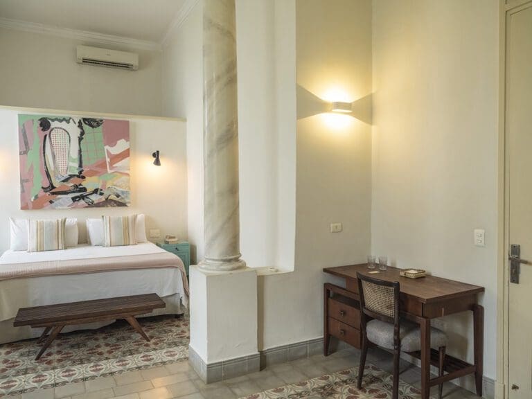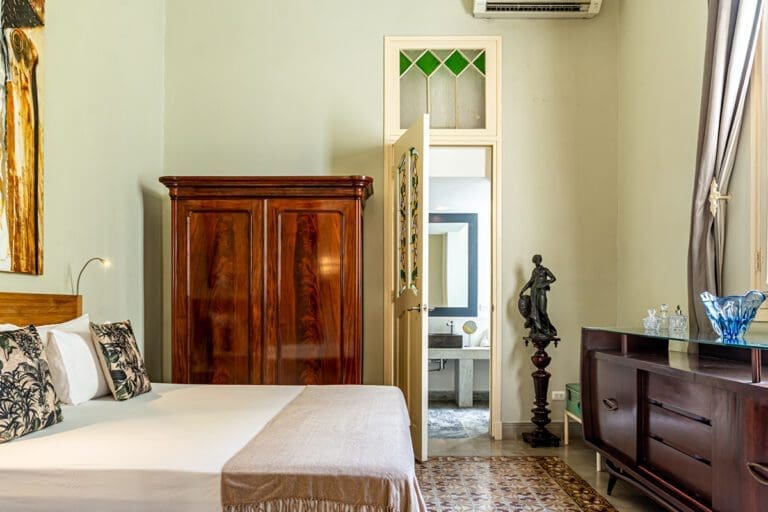 The standard room Paseo at the Boutique Hotel La Reserva Vedado, located in the elegant main house of the hotel, offers a perfect blend of sophistication and comfort. Its neoclassical décor, with delicate touches of classic style, highlights the beauty of an antique wooden wardrobe, which adds distinction to the atmosphere.