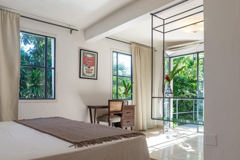 Standard room with a bright and cozy atmosphere, where contemporary design blends with classic Vedado details. It features a double bed, large windows overlooking the garden, and elegant décor with local artwork. The room includes a private bathroom equipped with exclusive amenities. Perfect for those seeking an intimate and refined experience in the heart of Havana.