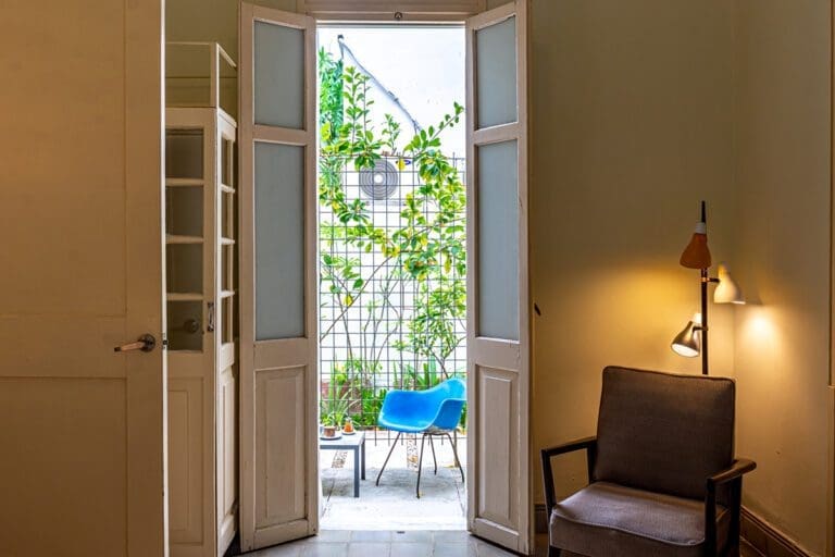 Like a tree house, from the wooden terrace of this room, you can enjoy the green foliage of the hostel’s garden. Artistic suite with a nod to Mondrian, bright, airy and comfortable, this is how we define it.